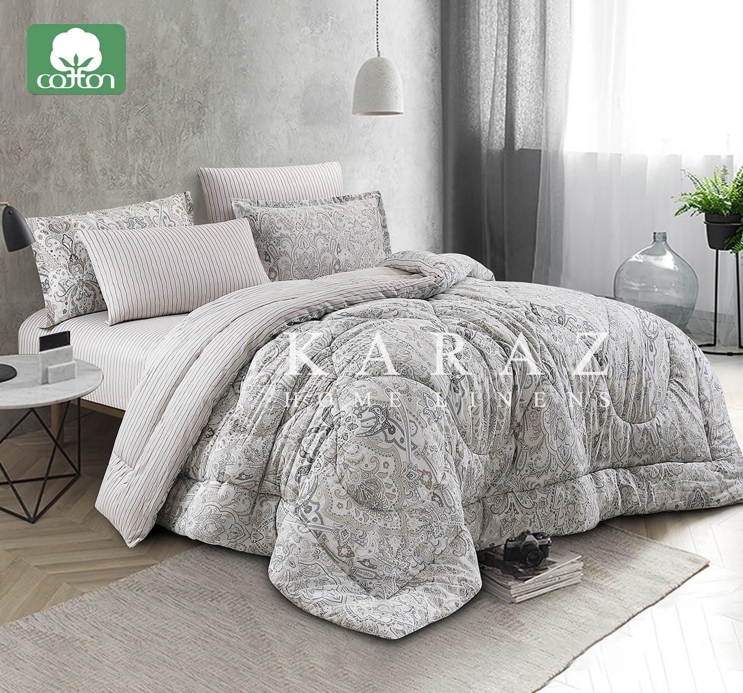 عزّزي من ديكور مفروشات سريرك باقتناء طقم اللحاف الرائع هذا.مصنوع من القطن الصافي ( قطن %100) عالي الجودة فائق النّعـومة مريح للغاية، كما يتميّز بطبعات جميلة تزينها وتعزّز من مظهره، وبأَلـوان ورُسومات مُشرقة تَليقُ بفَصل الصّيف،  يمكنك أيضا تنظيفها في غسالة الملابس عند الحاجة.