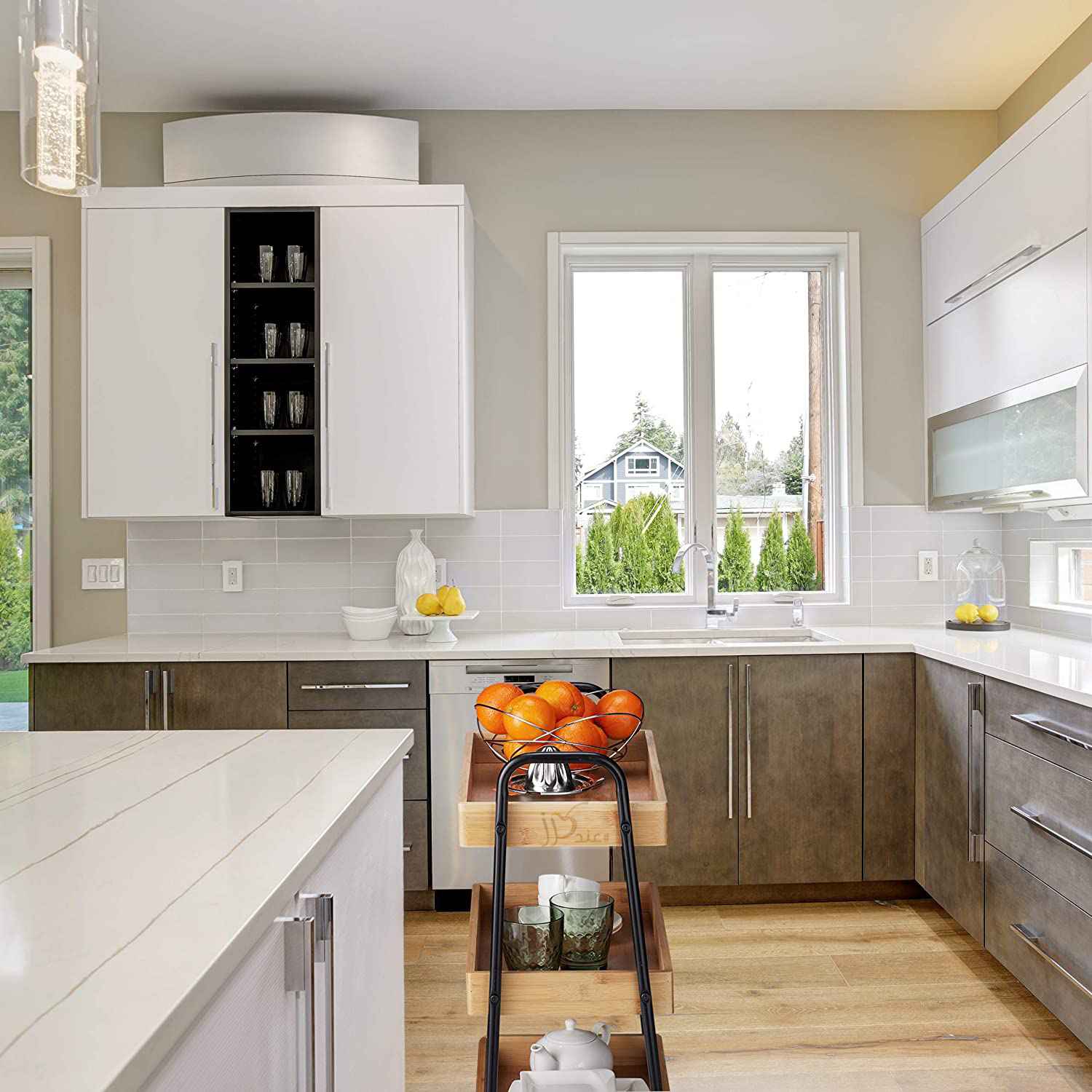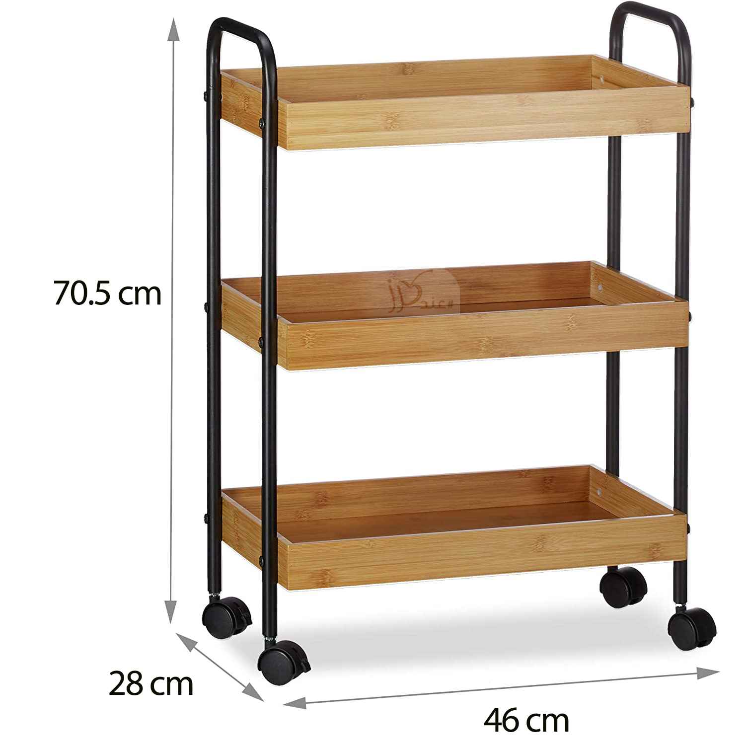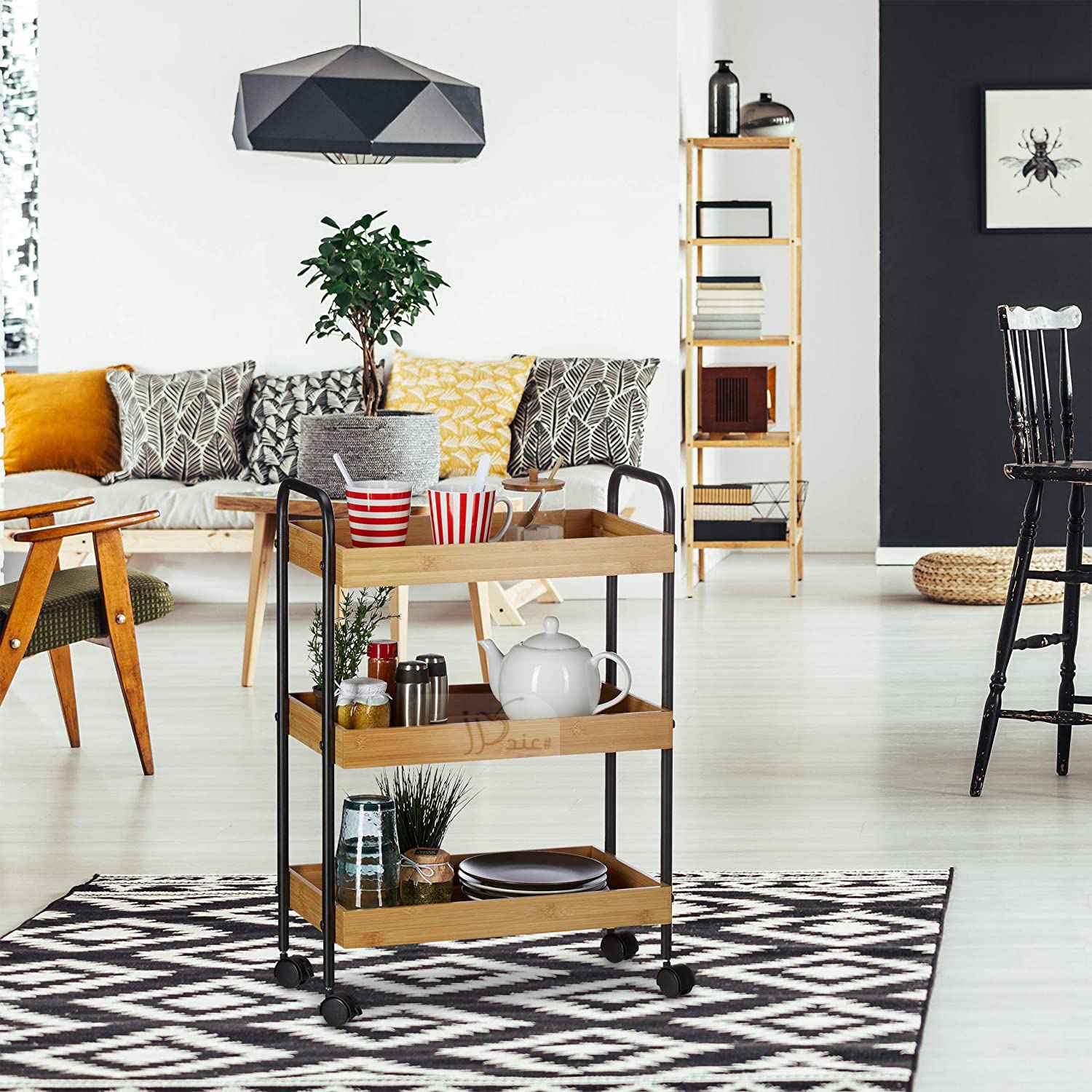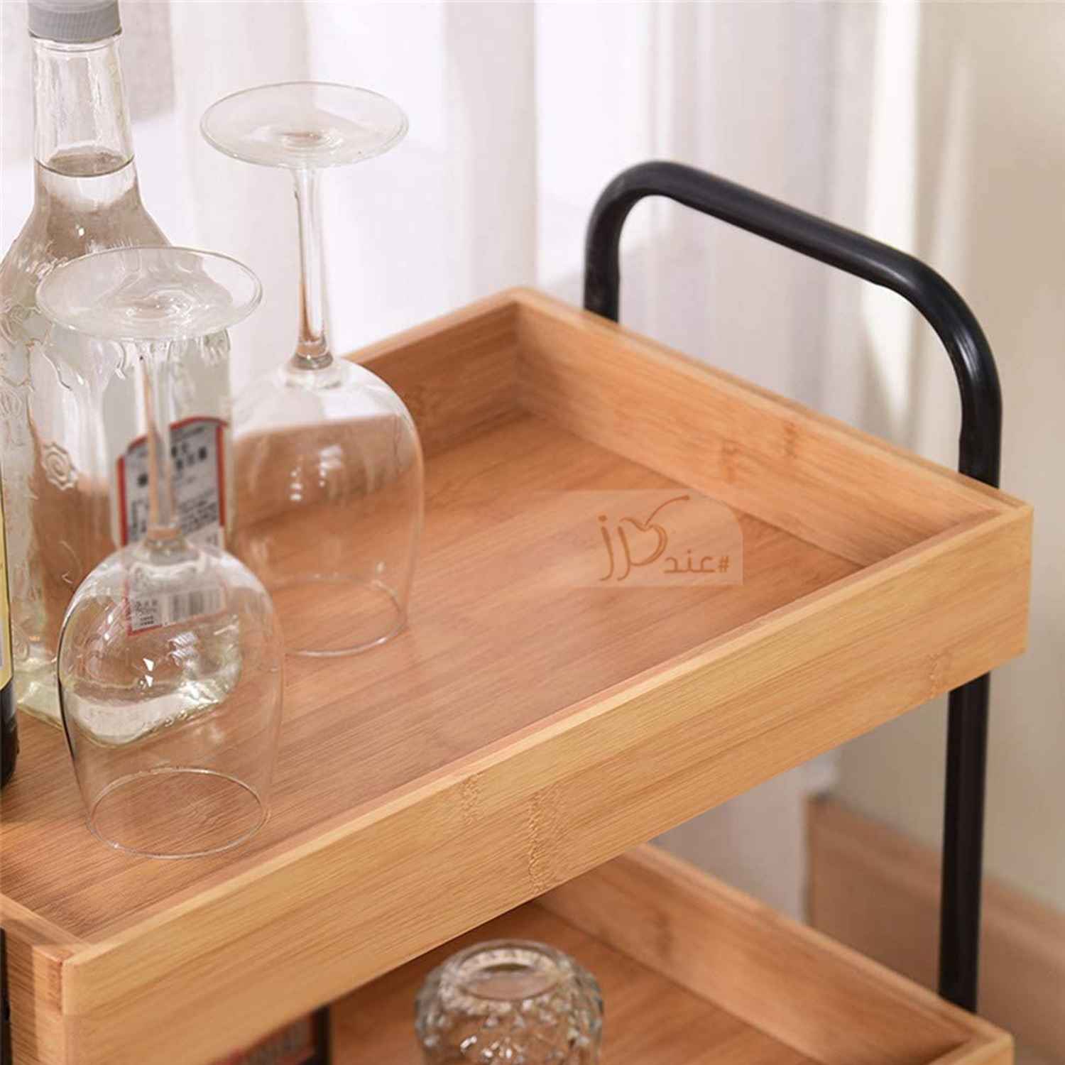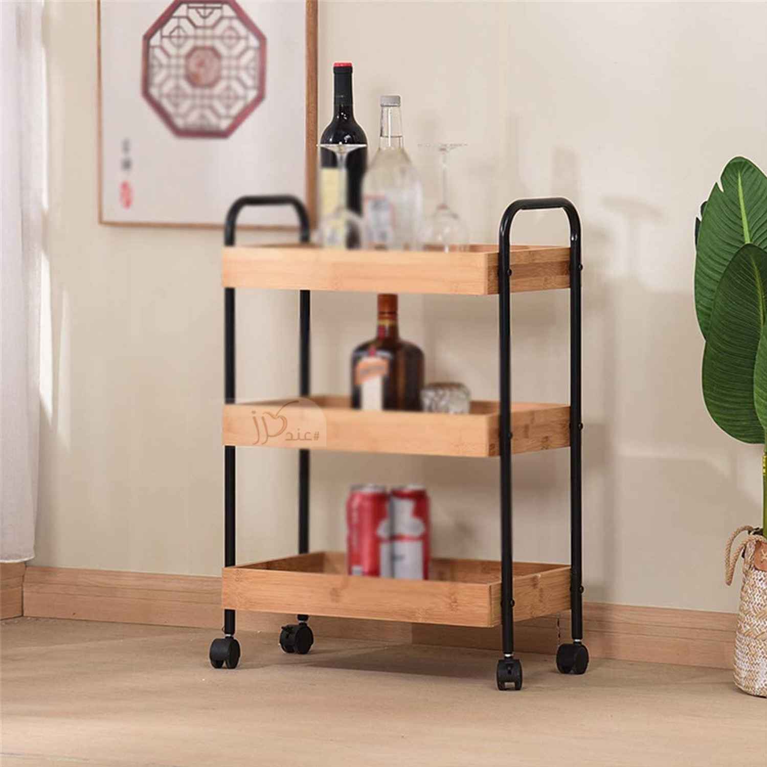 This product is a log 3-tier serving cart, trolley cart, made of metal and bamboo. The 3-tier serving cart features three spacious storage shelves to give you ample storage space while saving you floor space. ideal for serving coffee and other drinks when hosting guests. This rolling bar cocktail cart is equipped with 4 easy roll caster wheels so you can effortlessly move the cart around and two of the wheels are equipped with a lock to keep the cart in place. It can be used as a kitchen rack, or as a dining cart with easy mobility and used for home, living room, kitchen, party, and so on.