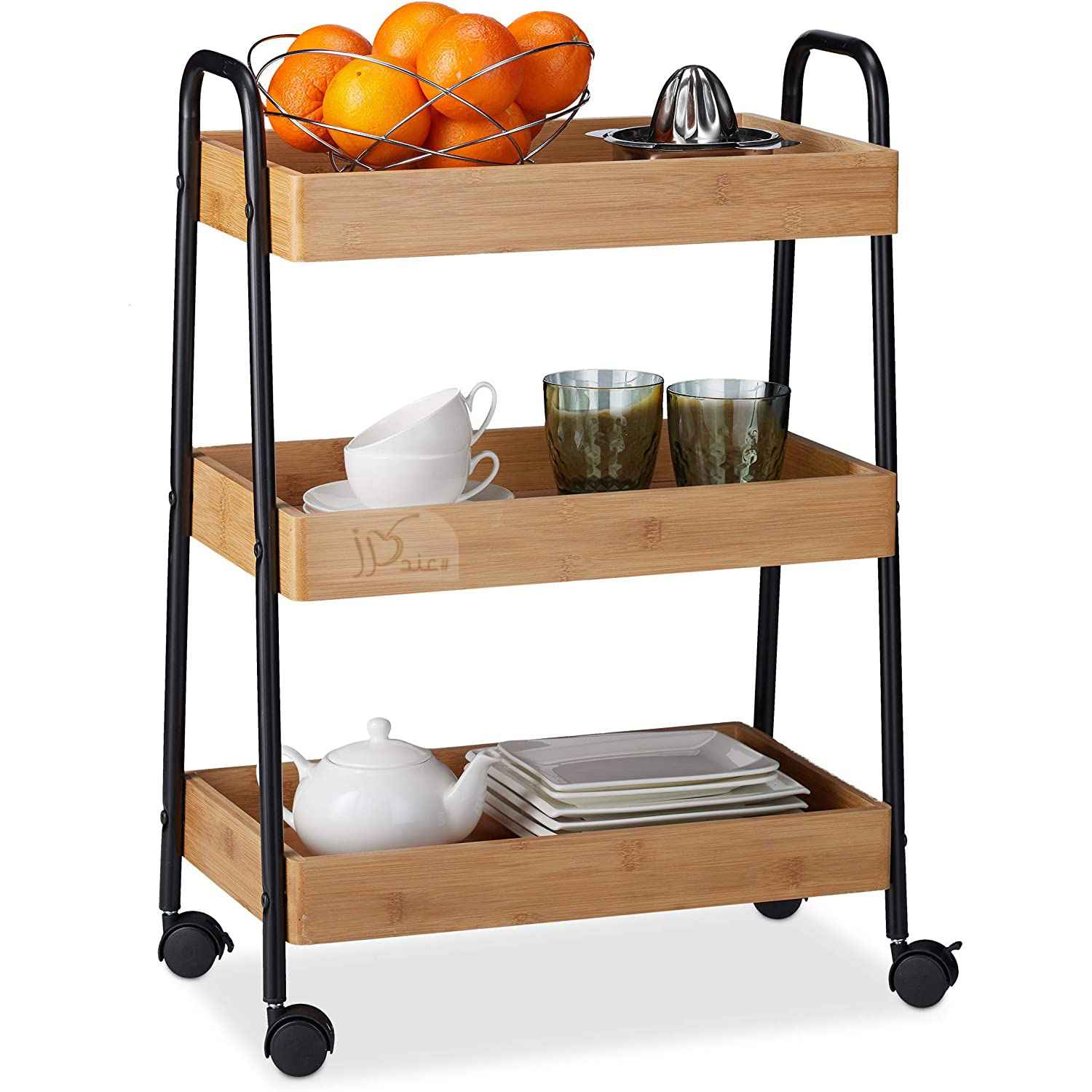 Bamboo Serving Cart, 3 Tiers, 360° Rotating Wheels, Handles, Steel Frame